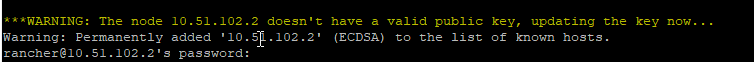 - When prompted to enter the SSH password, enter the password to be used for the rancher user. A strong password must be entered.