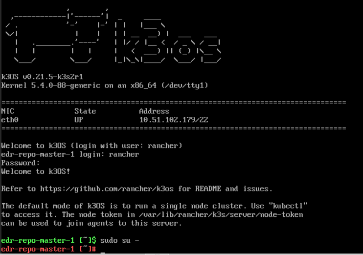 - Log in using the rancher user (without the password) and run the following commands in order to start the K8S node installation: