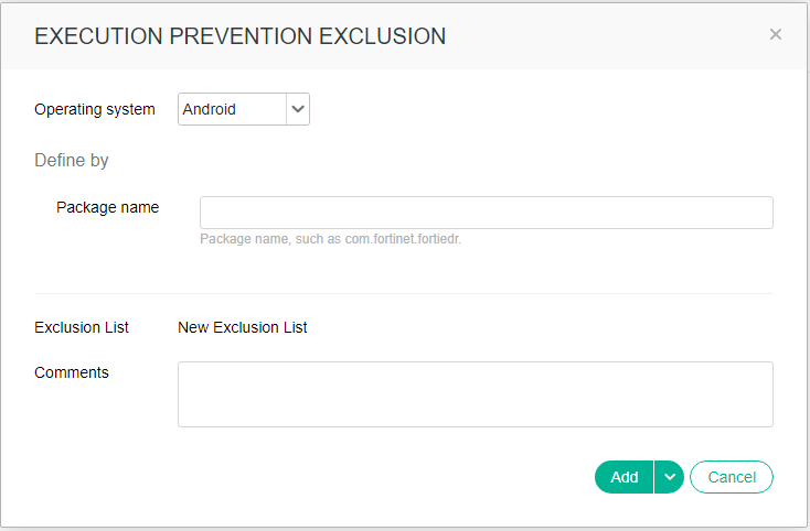- For mobile, select Android for Operating system and specify the package name. Note that FortiEDR does not support execution prevention on iOS.
