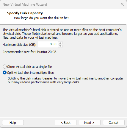 80GB, leave the default option as Split virtual disk into multiple files and click Next.