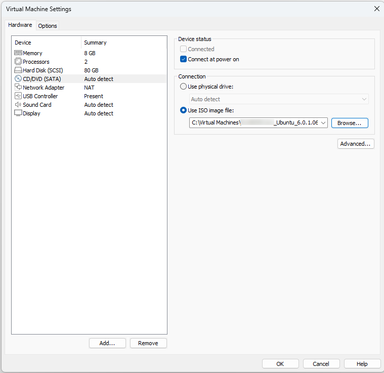 - Click the Browse button and select the ISO file provided by Fortinet for the FortiEDR Core. Click OK.