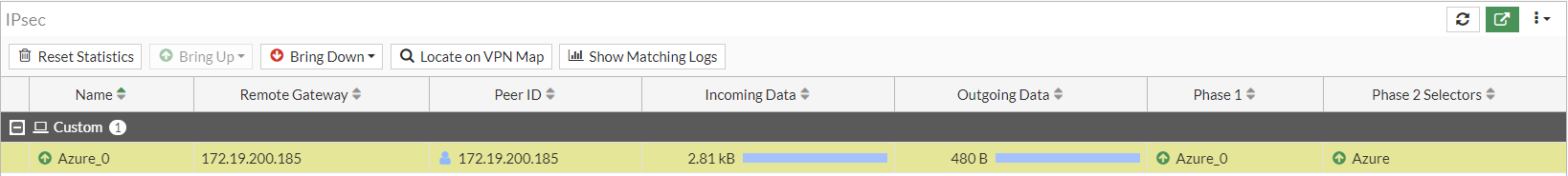 - In FortiOS, go to Dashboard > Network and expand the IPsec widget. Observe that the tunnel is up.