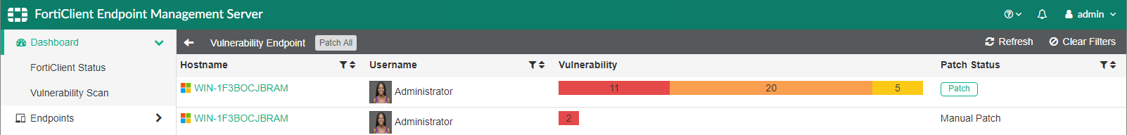 Click this button to patch all vulnerabilities currently displayed on the content pane. The vulnerabilities are patched with the next Telemetry communication between FortiEndpoint and the endpoint.