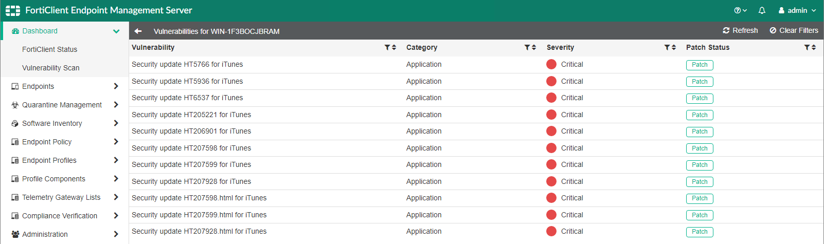 You can click the Patch button to patch the selected vulnerability with the next Telemetry communication between FortiEndpoint and the endpoint.