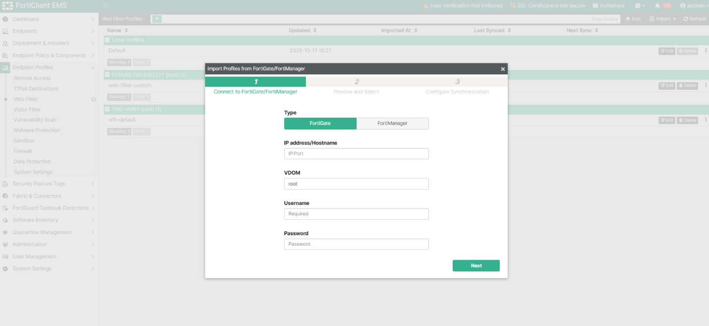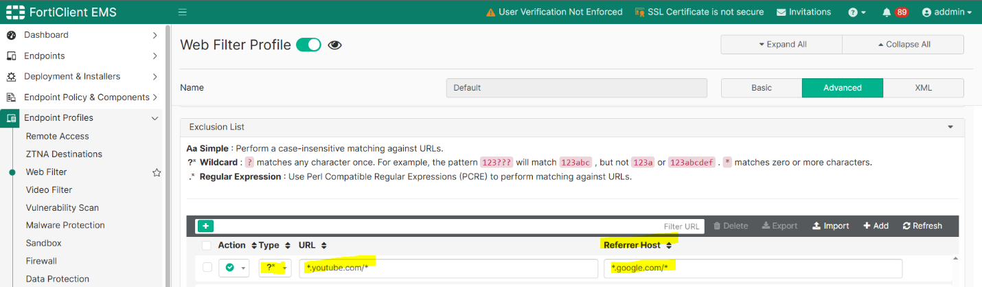 Referrer-based exclusions imported from FortiGate or FortiManager work exactly as configured on FortiGate or FortiManager. The entries cannot be modified from EMS GUI or XML for integrity.