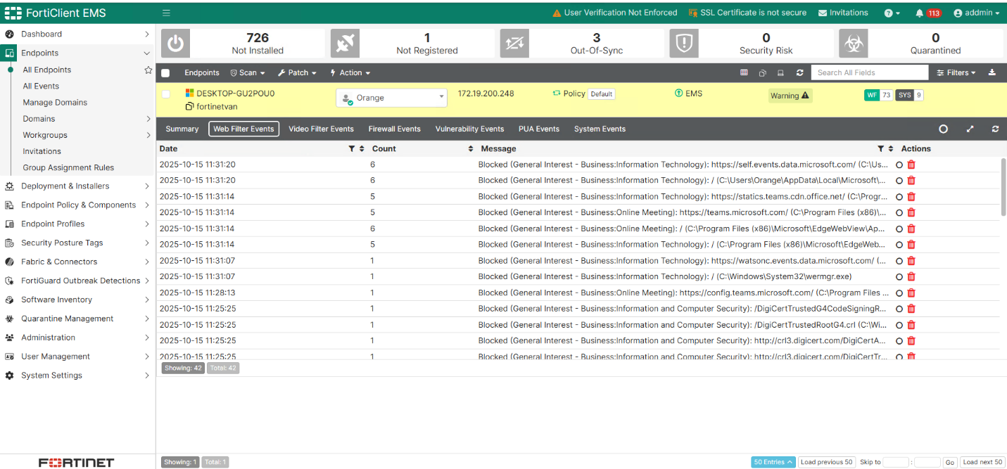 Go to EMS and verify that violations are also logged for that specific endpoint: