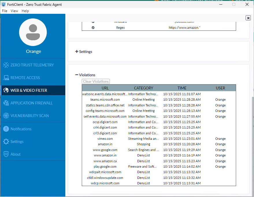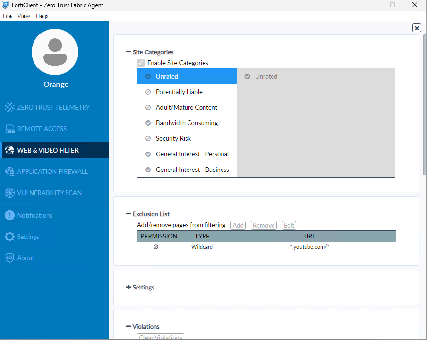 On an endpoint, open FortiClient and verify that the configured exclusion list is visible under the Web & Video Filter tab after syncing from the EMS.