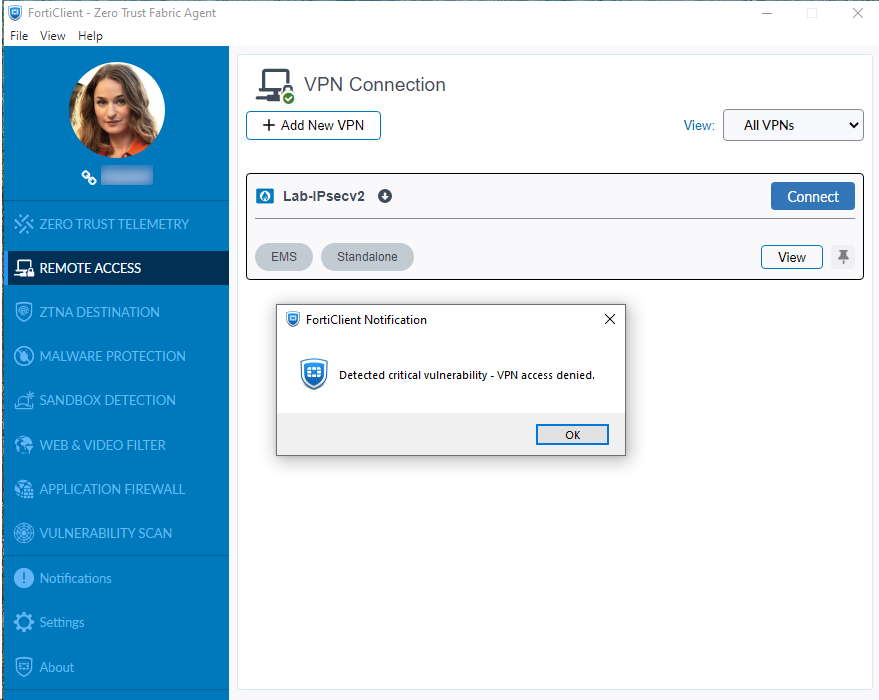 After the next communication between EMS and FortiClient, endpoints with this profile applied are unable to connect to this VPN tunnel if they have critical vulnerabilities. The following shows the notification that the end user sees when their connection to the VPN tunnel is prohibited due to critical vulnerabilities on their device.