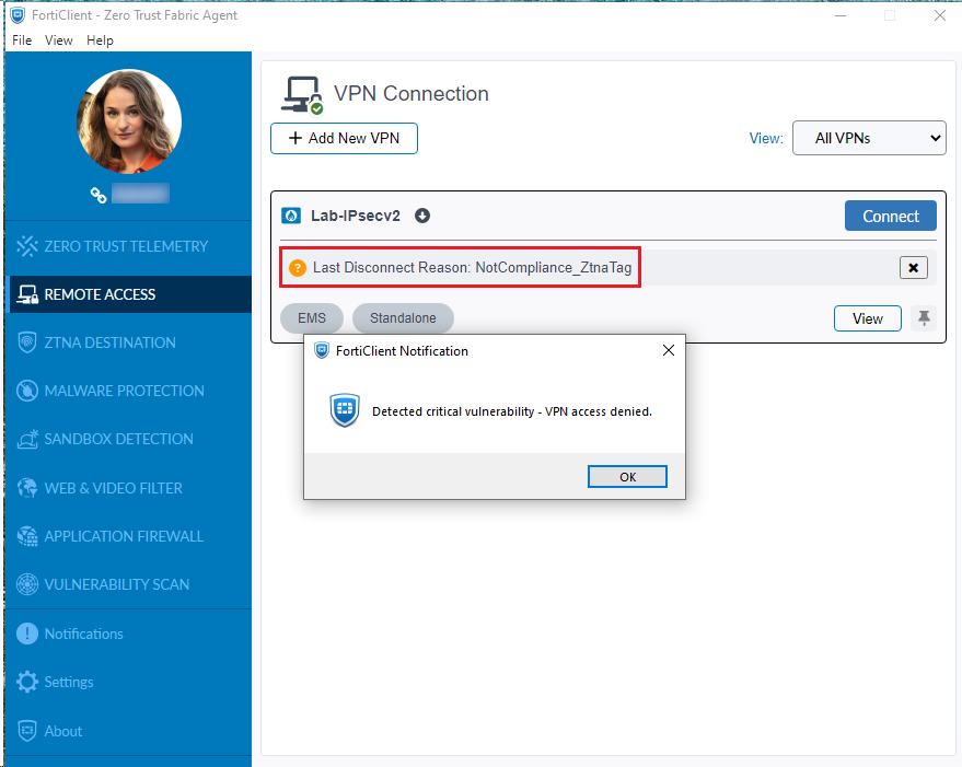 After the end user fixes the vulnerabilities and connects to the VPN successfully, FortiClient periodically checks the tag compliance status of the endpoint to ensure security. If the endpoint has critical vulnerabilities again, FortiClient terminates the VPN connection with the same error and a warning message with the reason of the VPN disconnection:
