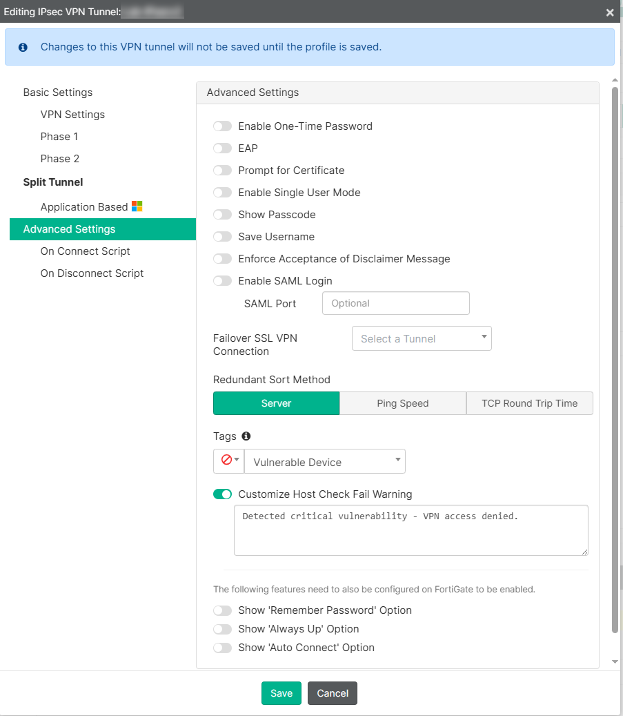 - Enter a message to display to users when their connection to the VPN tunnel is prohibited due to critical vulnerabilities on their device.