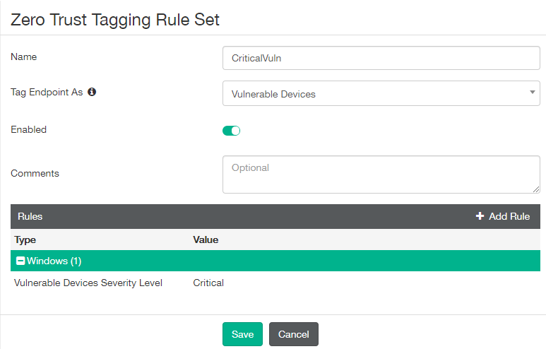 - Create a security posture tagging rule set that tags endpoints with critical vulnerabilities with the "Vulnerable Devices" tag: