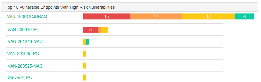 - Go to Dashboard > Vulnerability Scan. The Top 10 Vulnerable Endpoints With High Risk Vulnerabilities chart displays vulnerabilities per endpoint in a segmented bar graph and organized by severity.
