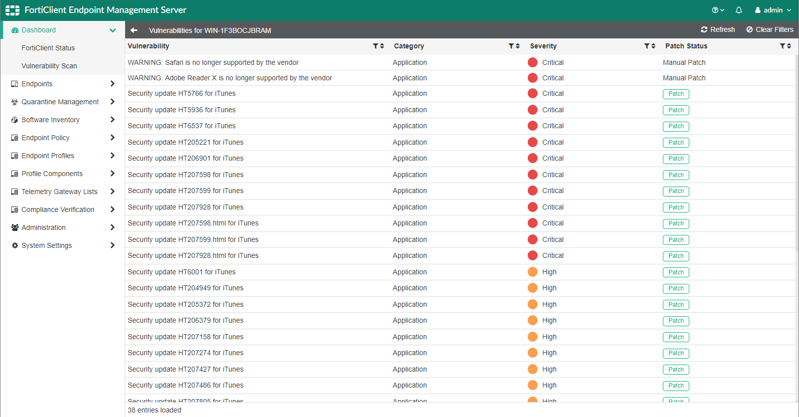You can click the Patch button to patch the selected vulnerability with the next Telemetry communication between FortiEndpoint and the endpoint.