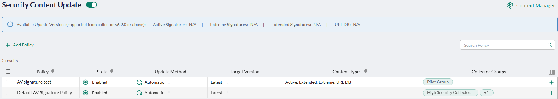 New EDR AV Signature policy to support OT and segmented environments that require controlled update windows (under Profiles > Security > Security Content Update in the EDR page). Use the AV Signature policy to define when and how EDR Collector groups download AV signatures for each type (Active, Extended, Extreme, and URL DB) based on time-based rules and time zones.