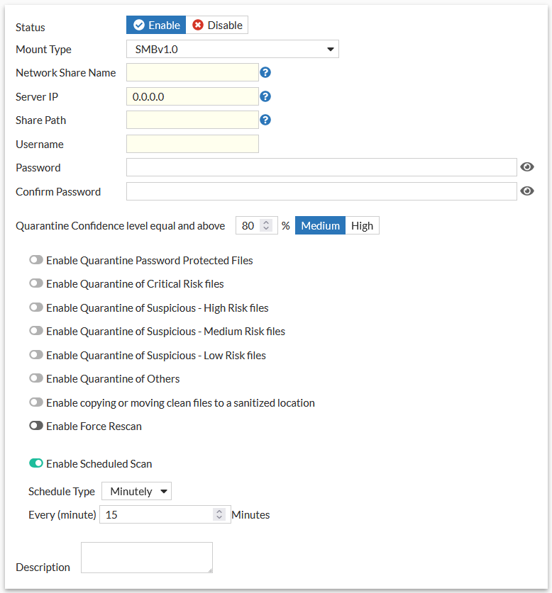 Network File Share (or Network Share) allows FortiNDR to scan remote file locations via SMB and NFS protocol. Central quarantine with either Move or Copy of files is supported.