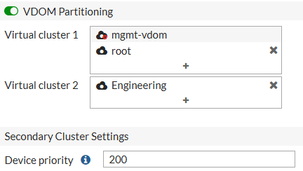 Configuring virtual clustering is the same as configuring standard FCGP HA with the addition of VDOM partitioning. Using VDOM partitioning, you can control the distribution of VDOMs, and the traffic they process, between the FortiGates in the cluster.