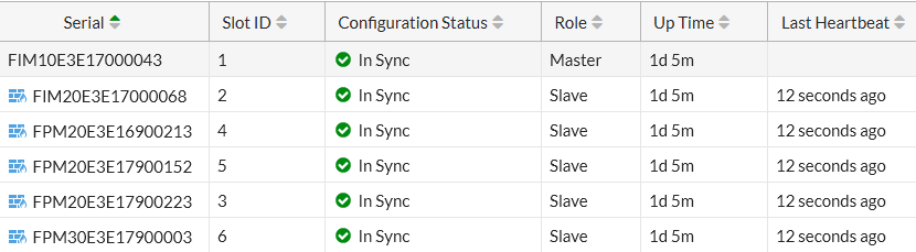 diagnose sys confsync status | grep in_sy FIM10E3E16000062, Slave, uptime=53740.68, priority=2, slot_id=2:2, idx=3, flag=0x10, in_sync=1 FIM04E3E16000010, Slave, uptime=53790.94, priority=3, slot_id=1:1, idx=0, flag=0x10, in_sync=1 FIM04E3E16000014, Master, uptime=53781.29, priority=1, slot_id=2:1, idx=1, flag=0x10, in_sync=1 FIM10E3E16000040, Slave, uptime=53707.36, priority=4, slot_id=1:2, idx=2, flag=0x10, in_sync=1 FPM20E3E16900234, Slave, uptime=53790.98, priority=16, slot_id=2:3, idx=4, flag=0x64, in_sync=1 FPM20E3E16900269, Slave, uptime=53783.67, priority=17, slot_id=2:4, idx=5, flag=0x64, in_sync=1 FPM20E3E17900113, Slave, uptime=53783.78, priority=116, slot_id=1:3, idx=6, flag=0x64, in_sync=1 FPM20E3E17900217, Slave, uptime=53784.11, priority=117, slot_id=1:4, idx=7, flag=0x64, in_sync=1 ...