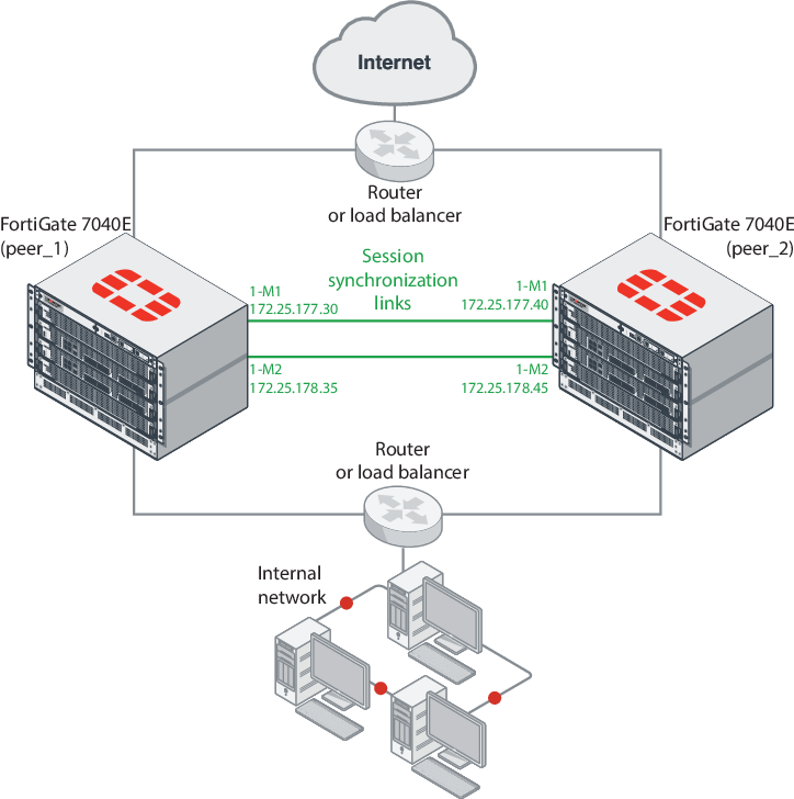 The interfaces of the two FortiGate-7040Es must have their own IP addresses and their own networking configuration. You can give the FortiGate-7040Es different host names, in this example, peer_1 and peer_2, to make them easier to identify.