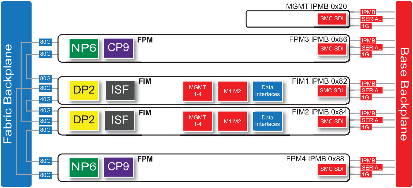 The SMM (MGMT), with Intelligent Platform Management Bus (IPMB) address 0x20) communicates with all modules in the chassis over the base backplane. Each module, including the SMM, includes a Shelf Management Controller (SMC). These SMCs support IPMB communication between the SMM and the FIM and FPMs for storing and sharing sensor data that the SMM uses to control chassis cooling and power distribution. The base backplane also supports serial communications to allow console access from the SMM to all modules, and 1Gbps Ethernet communication for management and heartbeat communication between modules.
