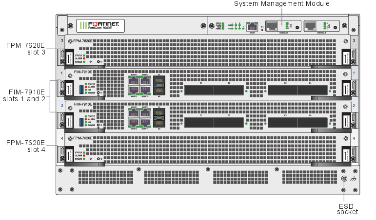 The FortiGate-7040E chassis is managed by a single System Management Module (SMM) that includes an Ethernet connection as well as two switchable console ports that provide console connections to the modules in the chassis slots. The SMM controls chassis cooling and power management and provides an interface for managing the modules installed in the chassis. The standard configuration of the FortiGate-7040E includes two FIM (interface) modules in chassis slots 1 and 2 and two FPM (processing) modules in chassis slots 3 and 4.