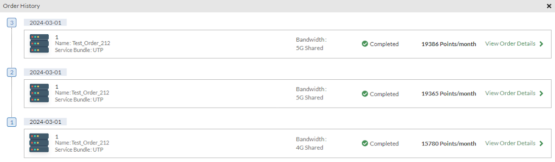 You can review the history of an order using the Order History feature. The Order History lists when an order was changed and allows you to review the configuration details of the change.