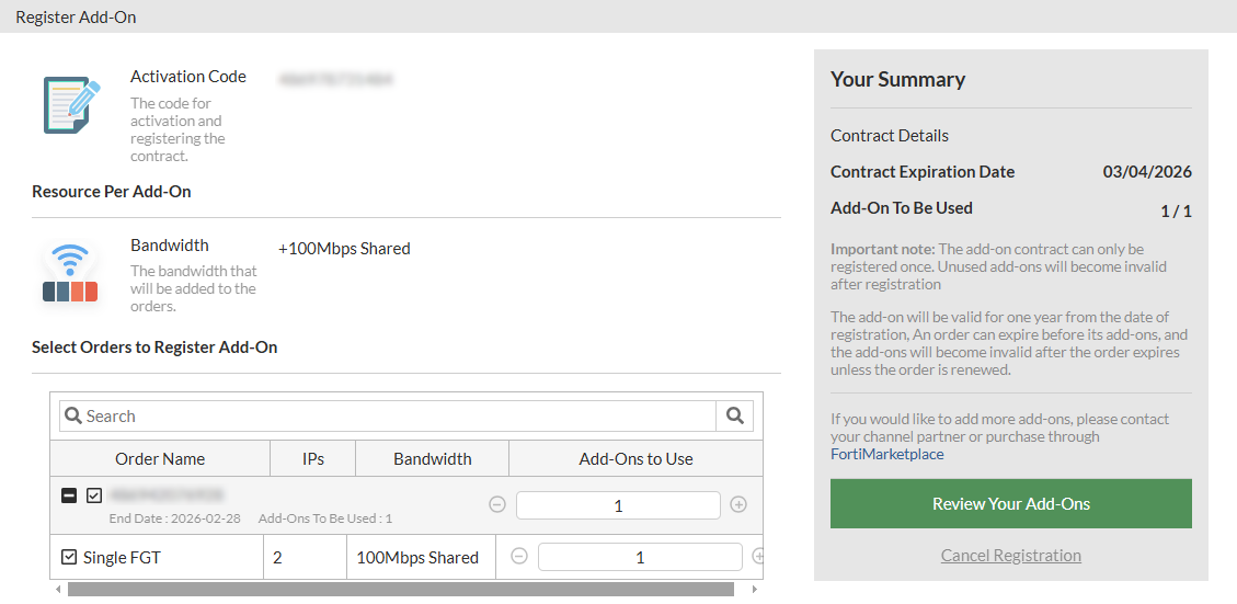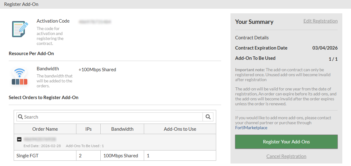 Review the details and click Register Your Add-Ons. The add-on will also be listed in the Contracts page.