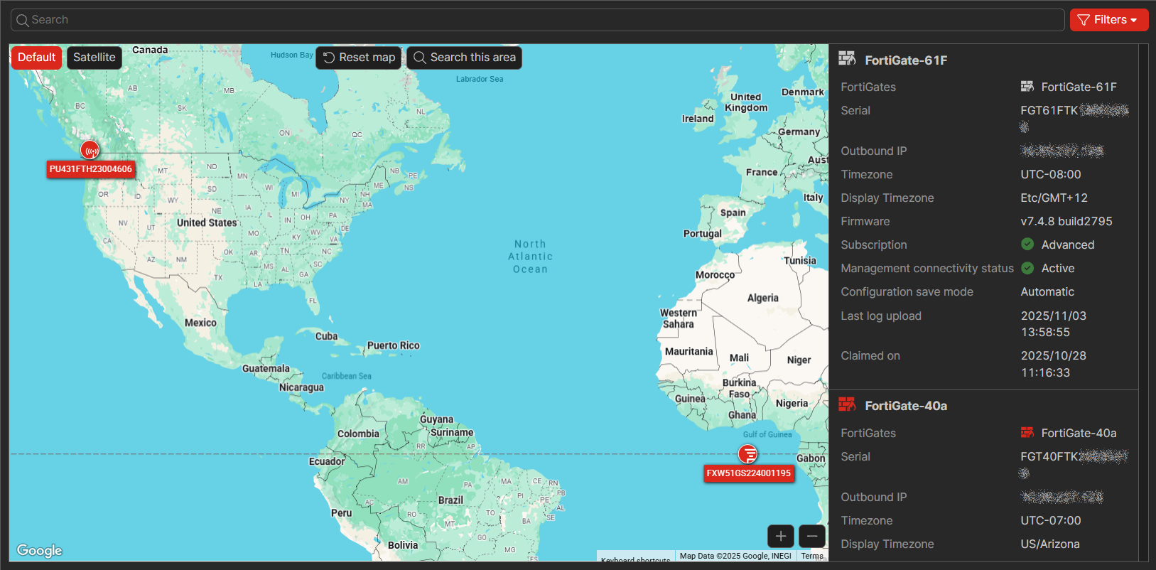 You can select go to Devices and Provisioning > Device map to view the device list as a map. This allows you to see the geographic location of the provisioned devices. The right panel displays a list of FortiGates that includes similar information as you can find in Device list. You can click the Locate on map icon for each device to zoom in to the device's location on the map. You can zoom in and out on the map using the + and - buttons in the lower right corner of the map. To return the map to the global view, click Reset map. For devices with a subscription, you can update their geolocation by dragging the device icon to the desired location on the map. You can also filter the map by device type, such as to only view FortiAPs.