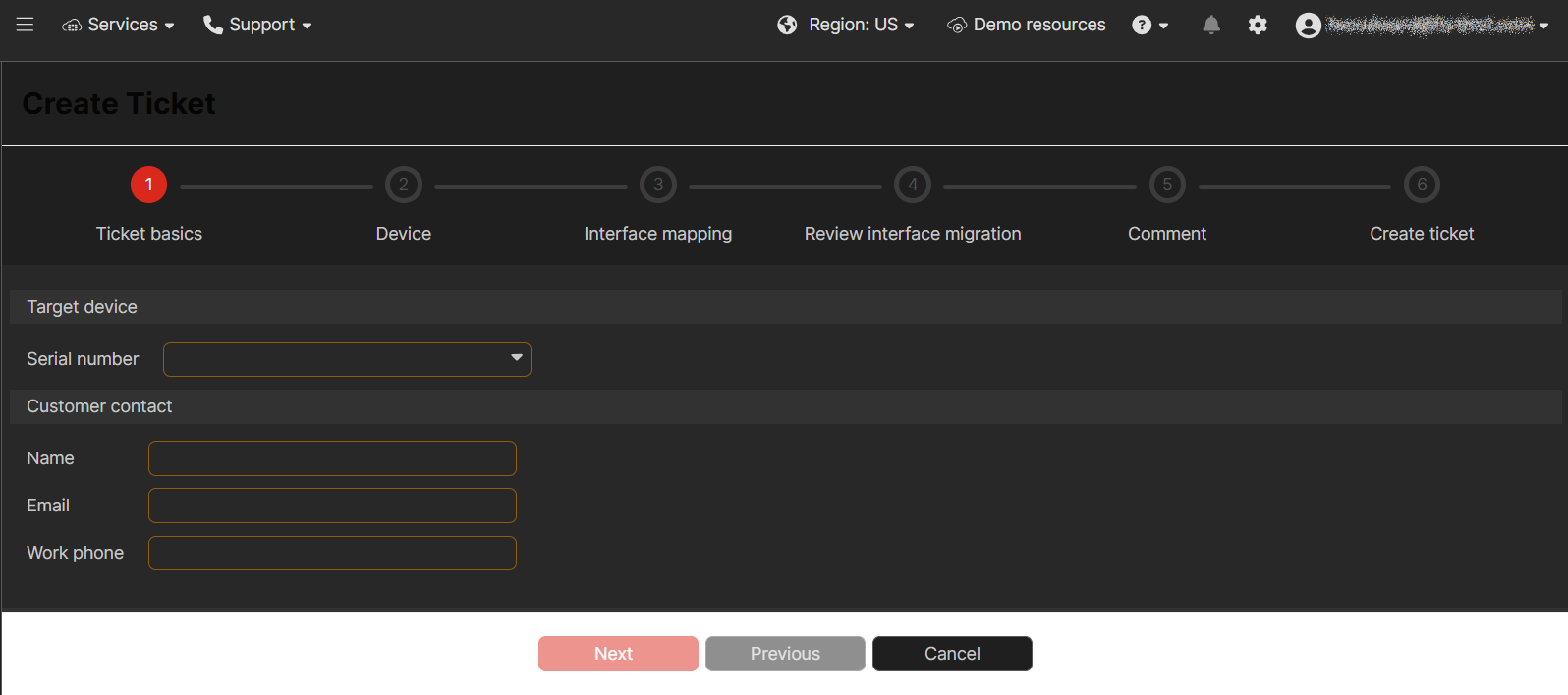 Go to FortiConverter > Tickets and click Create ticket. The Create Ticket wizard is displayed.