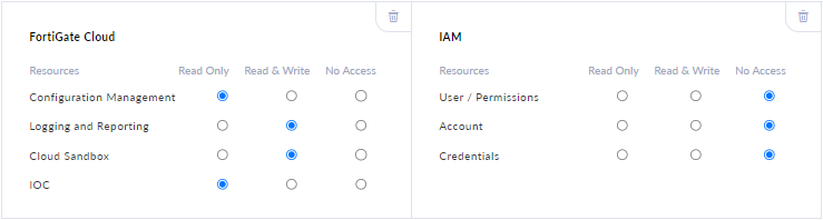 Enhanced permission model using FortiCloud IAM permission profiles and IAM users with resource-based access controls. FortiCloud IAM supports centrally managed permission profiles and user permissions across all FortiCloud services. These fine-grained access control for FortiGate Cloud provides greater flexibility in managing access to additional users of the FortiCloud account. For information on resources and permissions, see Creating a permission profile. |