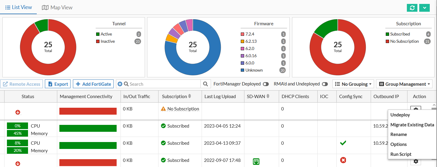 You see Assets when you first open FortiGate Cloud. From Assets, you can add a FortiGate as To deploy a FortiGate/FortiWifi to FortiGate Cloud using the FortiCloud or FortiDeploy key: describes. A user with an admin role can also go the device-specific Analytics, Management, Sandbox pages. A user with a regular role or subaccount admin role (multitenancy) can only go to the Analytics and Sandbox pages. You can view the device CPU and memory usage under the Status column.