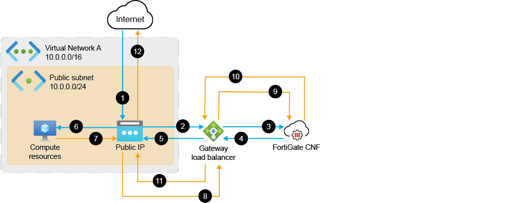 The FortiGate CNF instance inspects all external traffic inbound to compute resources and all traffic outbound from compute resources to the internet.