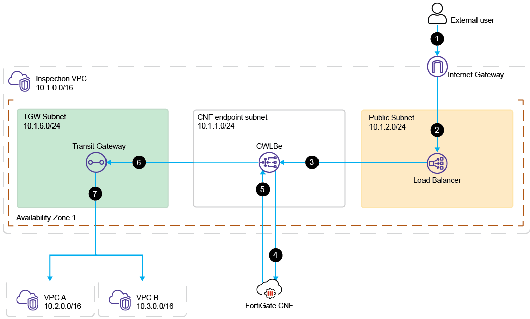 GWLBe sends traffic to the FortiGate CNF instance for inspection.