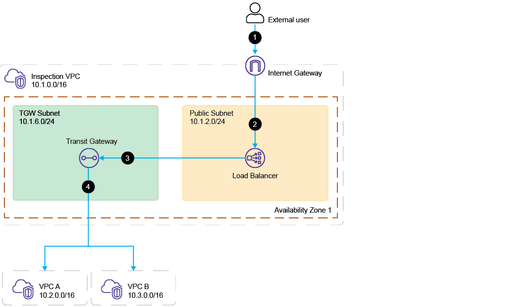In this scenario, there is a dedicated VPC called Inspection VPC that contains the load balancer. The workloads are in different VPCs (VPC A and VPC B), and traffic between VPCs is routed through a transit gateway.