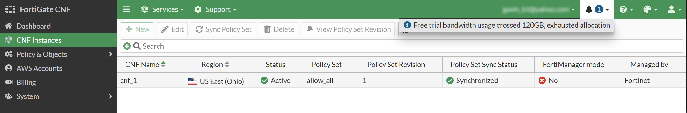After 120 GB bandwidth is exceeded, your FortiGate CNF free trial will be automatically suspended and then deleted.