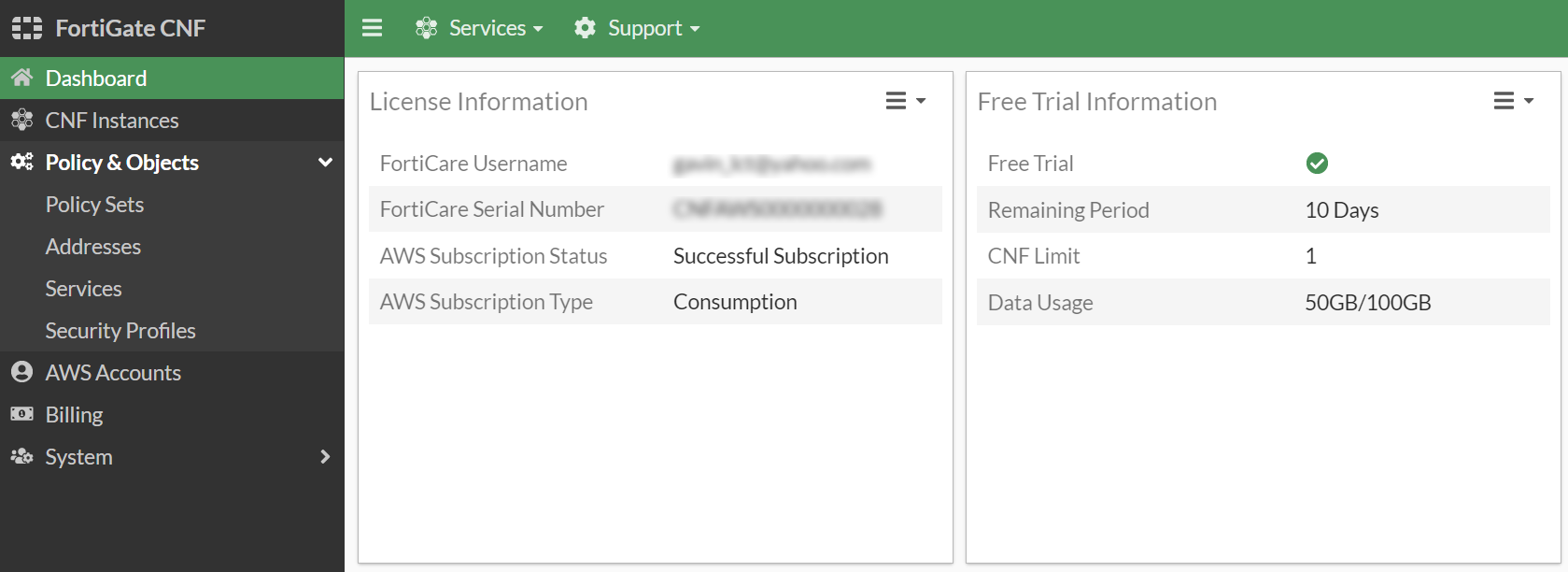 When you log in to the FortiGate CNF console, the Free Trial Information widget is displayed on the dashboard.