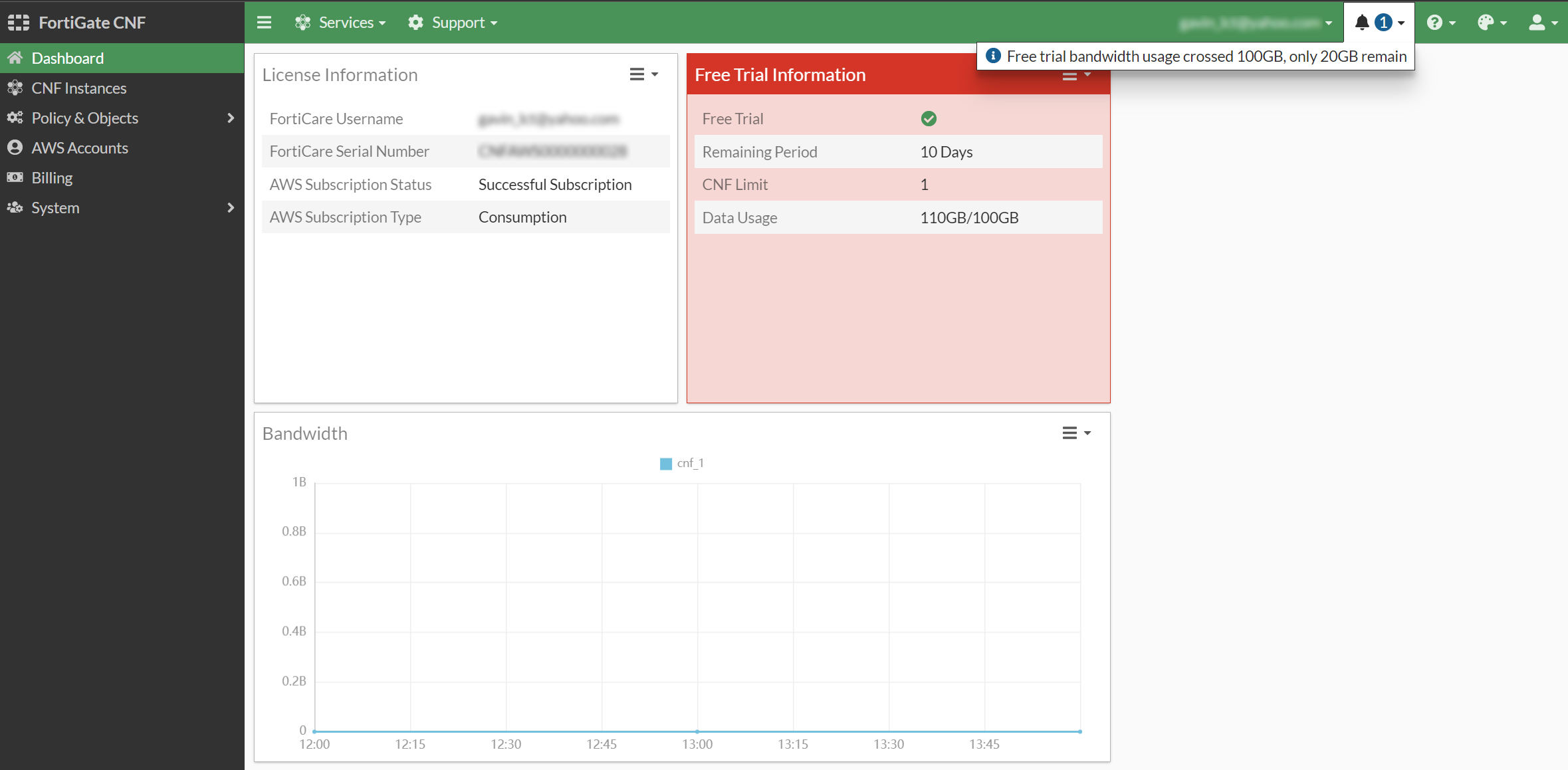 Once your bandwidth exceed 100 GB of traffic, FortiGate CNF displays alerts on the console and allows a grace of an additional 20 GB.