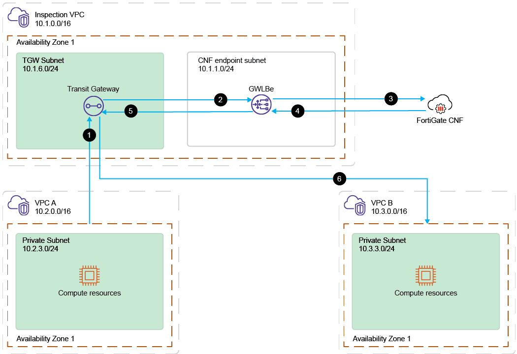 Traffic between two VPCs, VPC A and VPC B, is inspected by a FortiGate CNF instance.