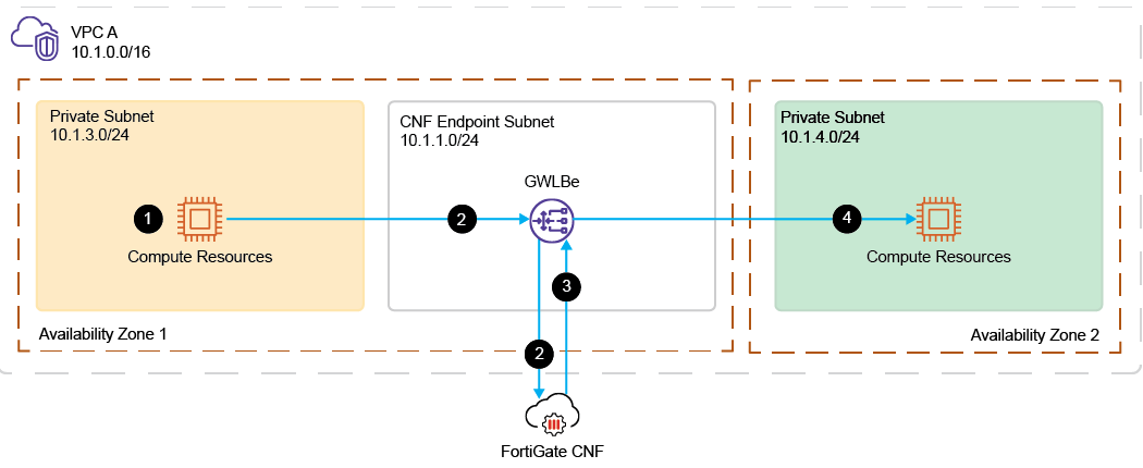 Traffic between two availability zones (AZ) in one VPC is inspected by a FortiGate CNF instance.