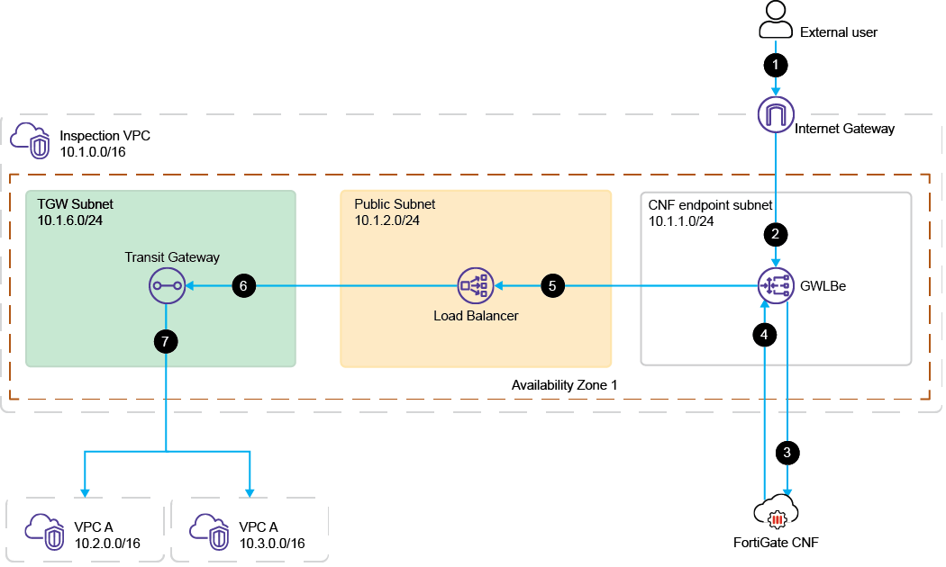 Inbound traffic is inspected by a FortiGate CNF instance before passing to the load balancer.