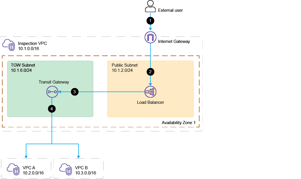 In this scenario, there is a dedicated VPC called Inspection VPC that contains the load balancer. The workloads are in different VPCs (VPC A and VPC B), and traffic between VPCs is routed through a transit gateway.