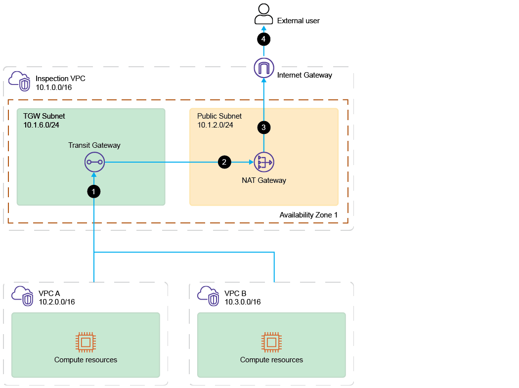 VPC A(10.2.0.0/16) orVPC B(10.3.0.0/16) and goes toAWS Transit Gatewaylocated inTGW Subnet(10.1.6.0/24) inInspection VPC(10.1.0.0/16). -