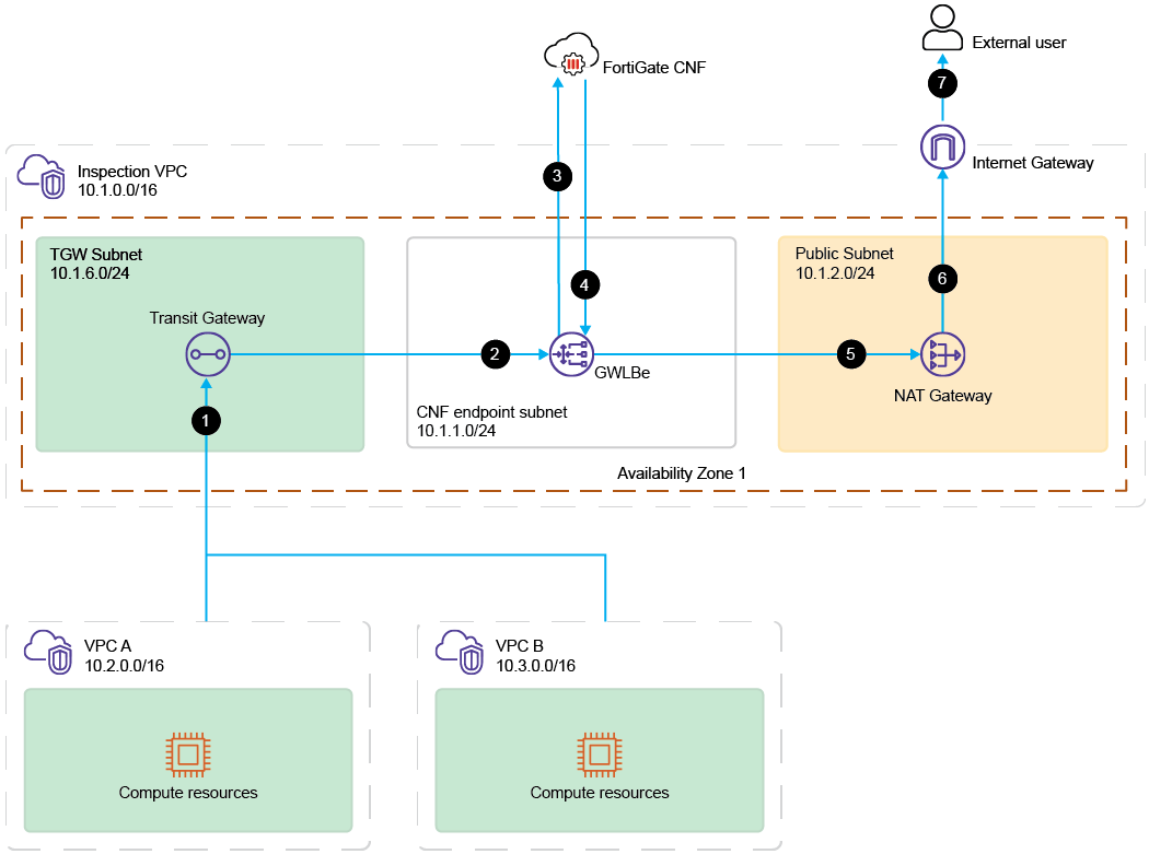Outbound traffic to the internet from a private subnet in VPC A or VPC B is inspected by a FortiGate CNF instance.