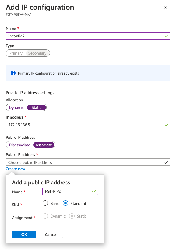 Once you have configured both IP addresses on the Azure side, you can create an additional virtual IP address on the FortiGate-VM. You do not need to modify the interface configuration on the FortiGate-VM.