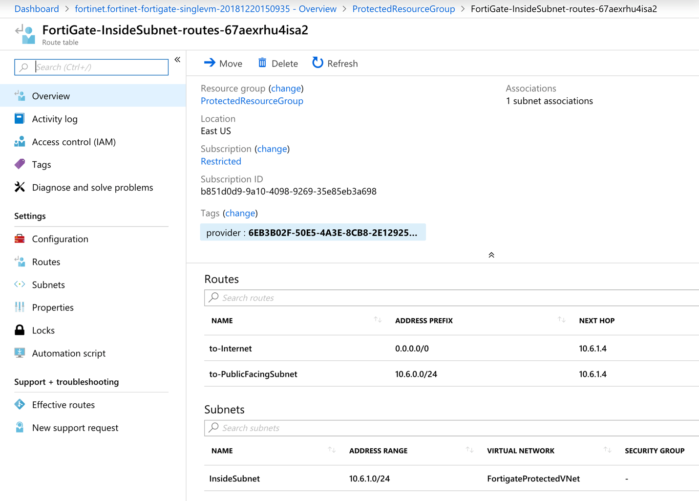 The "InsideSubnet-routes..." route table forces Internet-bound traffic to egress through the FortiGate port2 interface. If other subnets are created, add this route table to those subnets to provide the same egress filtering.