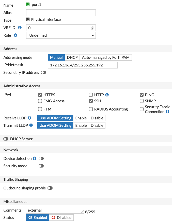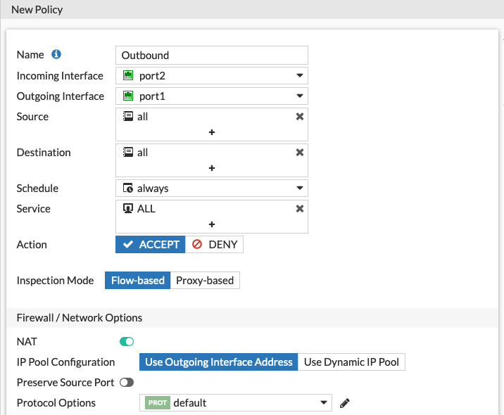 Here the policy is set to allow traffic coming in port1 to exit port2 if it is destined to the previously created virtual IP address.
