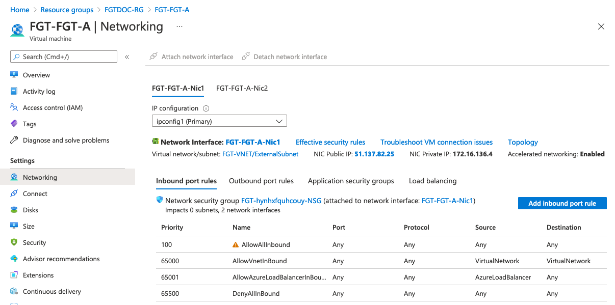 A single FortiGate-VM deployment from the Azure marketplace includes one Azure IP address configuration containing a public IP address and a local IP address. Azure performs 1:1 NAT between the two as traffic enters and exits the VNet. This configuration is called an instance-level public IP address. All types of protocols are forwarded using NAT from an external public IP address to the FortiGate private IP address that is linked to it in the network interface on Azure.
