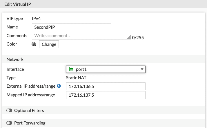 In this example, port forwarding is not enabled. You can enable port forwarding if you want to forward only a specific TCP or UDP port or port range. If you do not enable port forwarding, this enables forwarding of all ports designated to the new public IP address to the internal server, in this case at 172.16.137.5