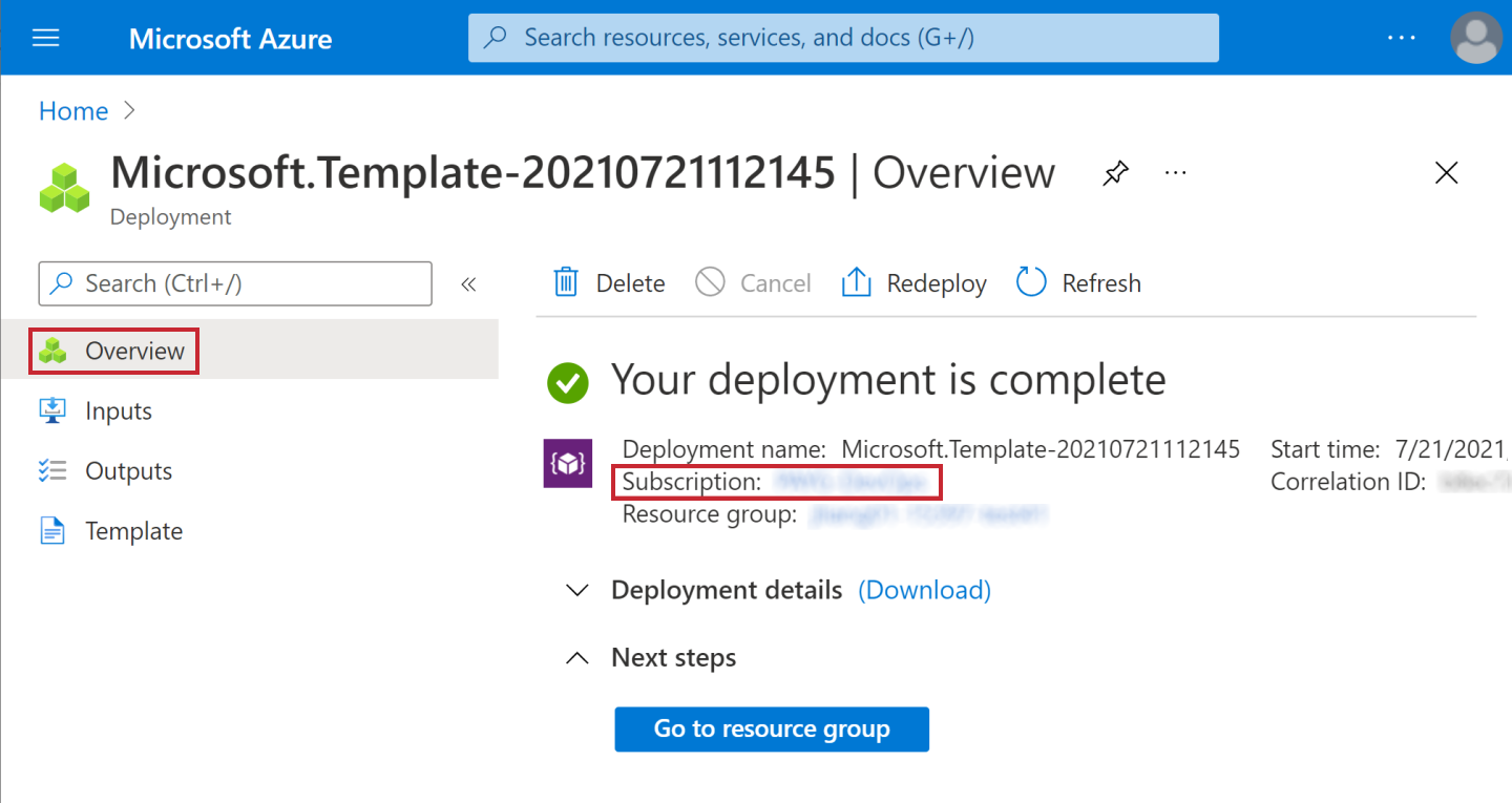 - Go to the Microsoft.Template Overview by following the steps 1-3 of the section Locating deployment Outputs.
