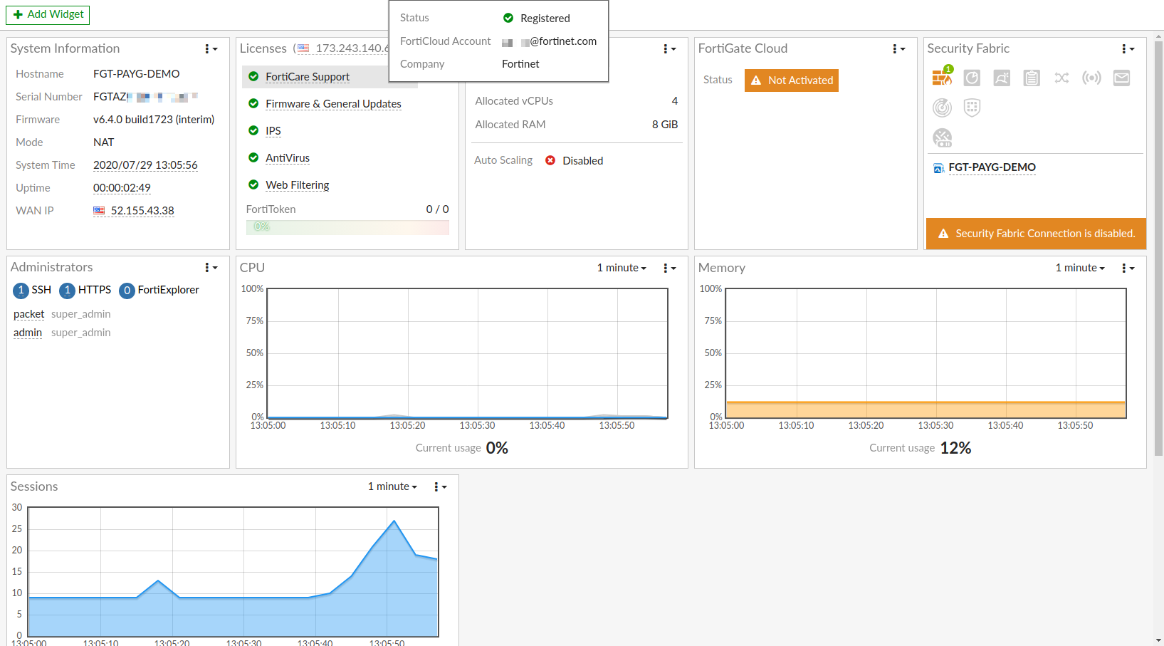 New Azure on-demand and upgraded instances can retrieve a FortiGate serial number and license from FortiCare servers. Using the serial number, users can register the device to their account and start using FortiToken and FortiGate Cloud services.