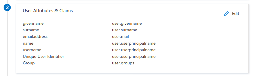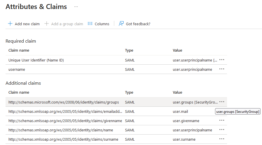 user-nameandgroup-nameattributes configured on the FortiGate entry should exactly match the username and group attributes that Azure AD returns. You can configure the list of SAML attributes that Azure AD returns under Username Attributes & Claims in the Azure portal.